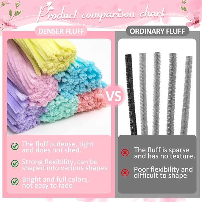 - Soft and User Friendly: the fuzzy sticks are soft to the touch, making them safe to use for a wide variety of craft projects; They are easily bendable allowing you to twist and twine them into many shapes you fancy, such as animal, fruits, flower and so on; Gear up for an enjoyable, hassle less, and effective crafting experience with these user friendly pipe cleaners; Enjoy crafting the way it should be, fun, and creatively stimulating