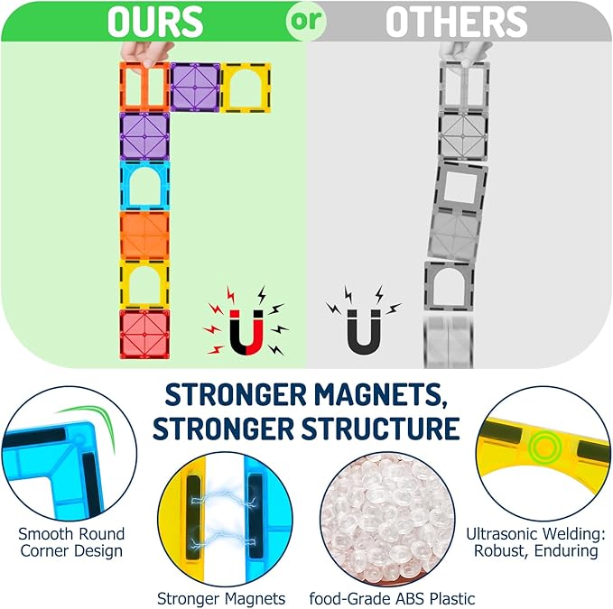 - Safe & Durable Kids Toys --- Our magnetic tiles toys are "CPSIA" and "ASTM" certified and do not contain any harmful gases. Made of safe and durable ABS plastic with advanced ultrasonic welding technology. The smooth surface and rounded edges allow children to play safely without causing scratches or damage. This is a perfect set of toys for 3 4 5 6 7 year old