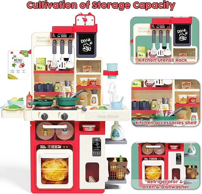 - The Toddler Play Kitchen: with various play kitchen accessories, up to 63pcs kitchen accessories, play food for kids kitchen, realistic sounds & lights, spraying and plays sink. Besides, there are several various storage space for store kitchen items, such as dessert shelves, refrigerator, an oven and etc., providing your kids with an authentic cooking experience and having hours of pretend play fun.