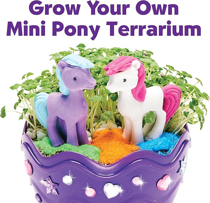- TERRARIUM KIT FOR KIDS: Give the gift of creativity with the perfect girls toys. Everything you need to grow a kids terrarium kit is included, just add water! Complete craft for girls ages 6-8+ includes potting mix, quick-growing chia seeds, pony stickers, dimensional accents, fun mini pony figures, and colored sand