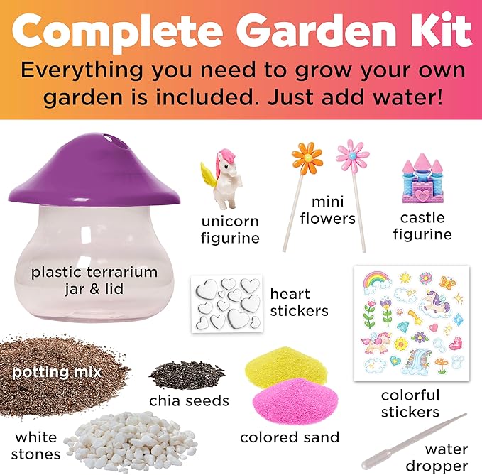 - UNICORN CRAFT: Give the gift of creativity with the hands-on STEM kits for kids ages 6-7+! Everything you need to grow your own unicorn forest is included; just add water. The complete terrarium kit includes a mushroom-shaped terrarium, 2 unicorn figures, potting mix, white stones, stickers, colorful sand for layering, mini-flowers, and more!
