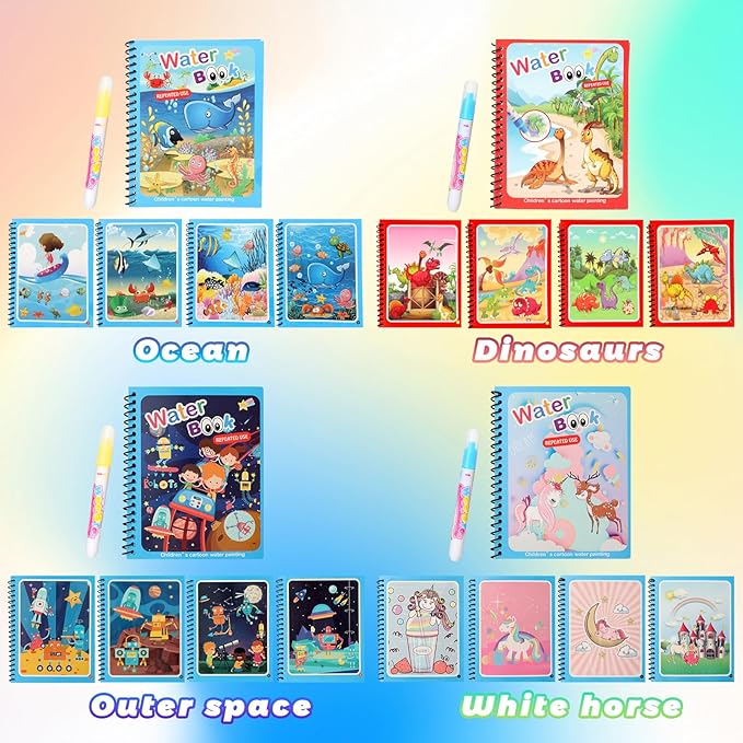 - 【Endless Creative Possibilities】With the Water Coloring Book, users can explore their creativity in a variety of ways. These pages are filled with intricate designs and patterns that allow a beautiful cartoonish picture to be achieved with a water pen.