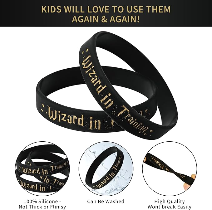 - 25 pack of black wristbands with “Wizard in Training” in gold lighting font. Makes a great addition to the popular movie themed party!