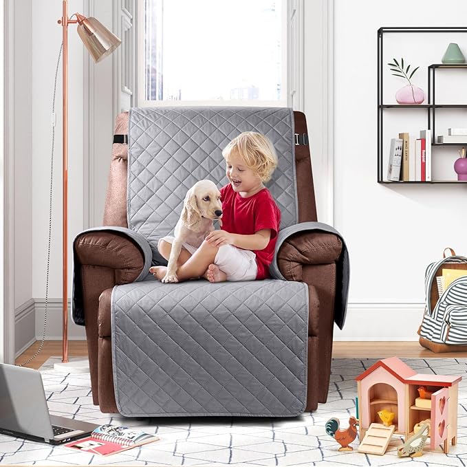 KinCam 100% Waterproof Recliner Chair Cover, Reclining Couch Covers for Pets, Dogs, Recliner Couch Slipcover Furniture Protector with Elastic Straps for Kids(30", Light Gray)