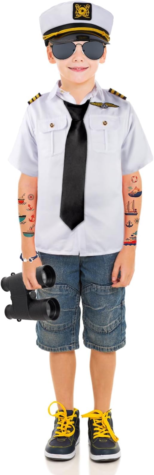 - Kids Yacht Costume: This kids yacht captain dress up set include a yacht sailors uniform top, a yacht hat, a pair sunglasses, a simulation telescope binoculars, a anchor rope bracelet and 2 pieces nautical temporary tattoos, complete set for yacht parties, captain cosplay and nautical-themed events