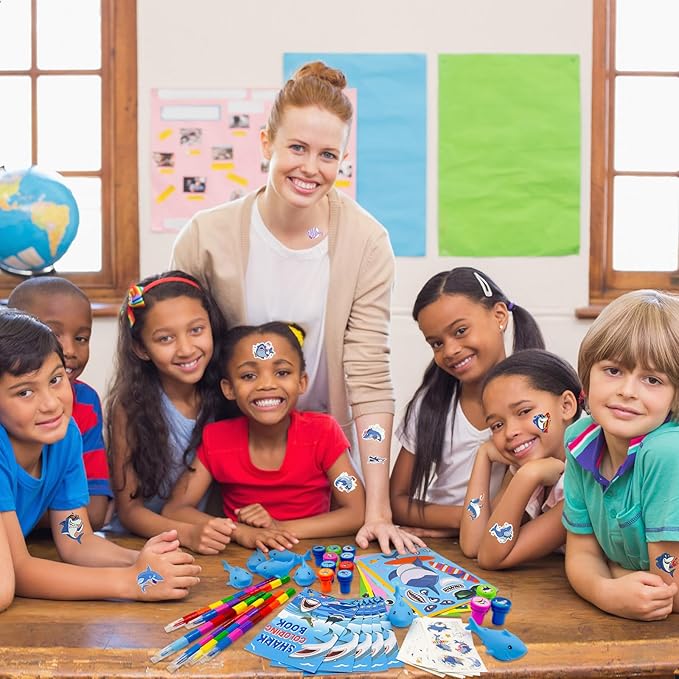 - Shark Party Favors Set: our shark school DIY set includes 12 coloring books(12 pages per book), 12 rainbow stacking crayons(8 colors),12 tattoos, 12 stampers, 12 DIY Art Craft stickers,12 sharks,sufficient quantity, and various styles enrich your shark birthday party