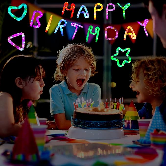 - 【LED Light & Stretch】When you remove the insulating strip and press the switch button, the pop tubes will emits bright light and lasts for a long time.also, you can change the 3 LED light modes.Stimulate your adult's imagination to Create alphabet letters, numbers, any other shapes and make up games for hours of entertainment.