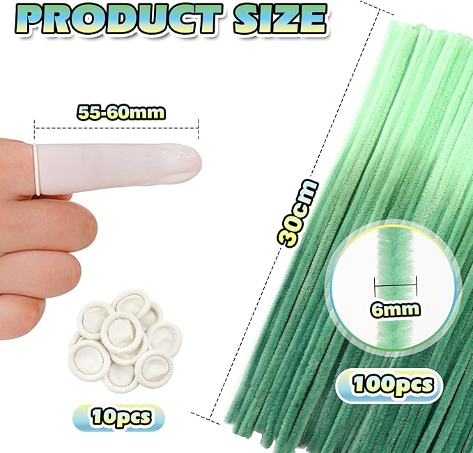 - Size: 100pcs gradient green pipe cleaners 0.24 X12 inch (6 mm x300 mm); 10pcs white disposable latex finger covers 55-60 mm