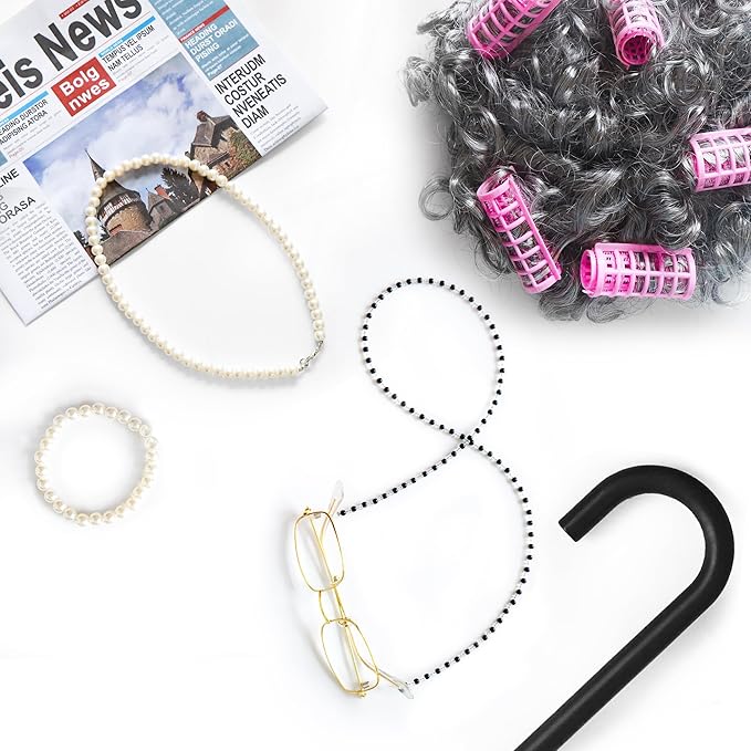 - YouthBro Full Old Lady Costume Pack with 1 x old lady costume dress clothes; 6 x pink HairCurlers; 1 x old lady wig; 1 x black cane; 1 x granny glasses; 1 x grandma costume eyeglass chains strap; 1 x faux pearl beads necklaces; 1 x fake pearl beads earrings; 1x faux pearl beads bracelet; 1 x wig cap; 1x black handbag