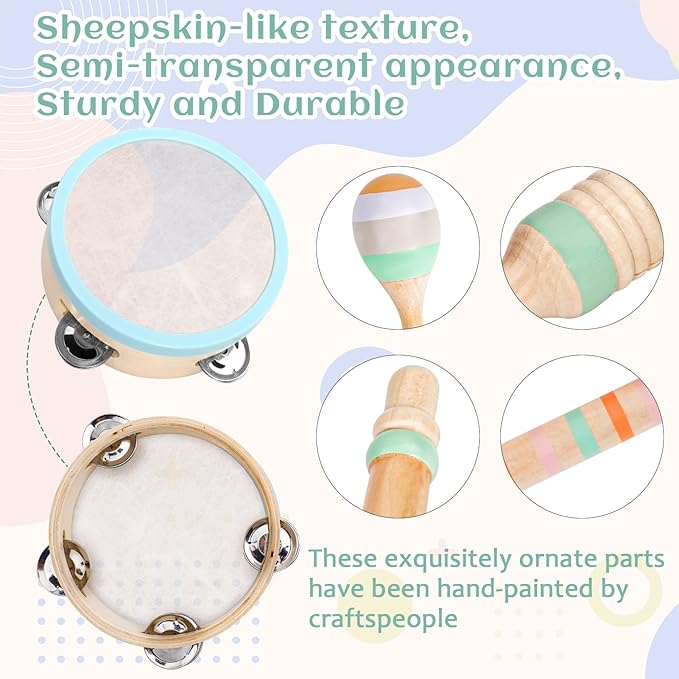 • ✨【Exquisite Craftsmanship】The drum surface of the tambourine is crafted from imitation sheepskin, offering a semi-transparent appearance and a realistic texture, ensuring durability and resilience. The clarinet, wood sounder, hand bell, and two maracas are adorned with intricate hand-painted designs. This meticulous hand-painting process not only requires considerable time and effort but also results in stunning, individualized pieces, each displaying unique beauty and charm.