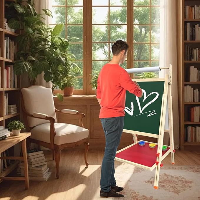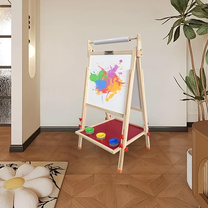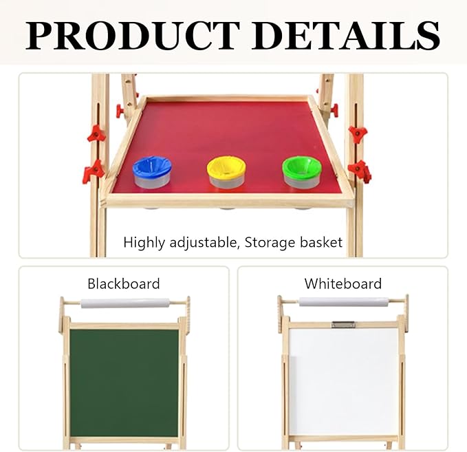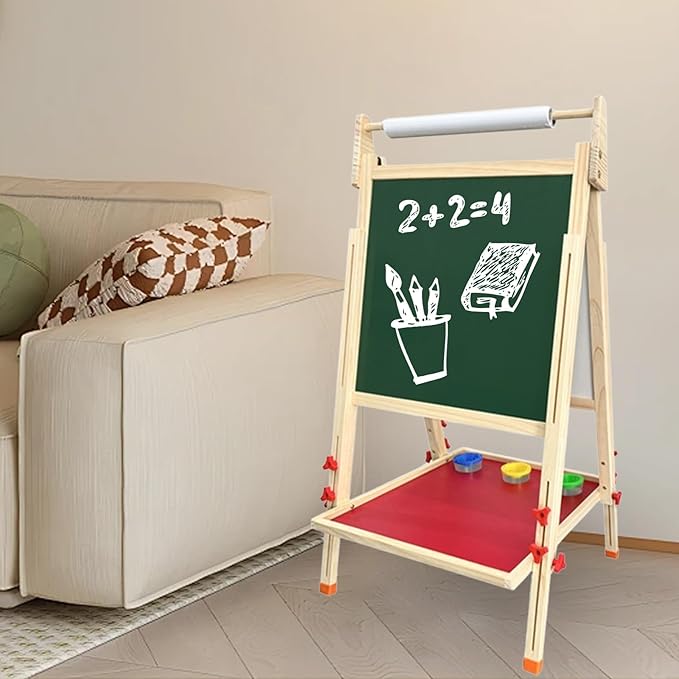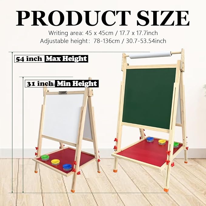 - Abundant and multi-functional accessories:Accessories include 3 whiteboard pens, 1 roll of paper, 1 animal stickers, 1 number and letter stickers, 6 dust-free chalks, 1 removable eraser, 1 magnetic ruler, 1 chalk holder , 3 water cups, and abundant accessories allow painters to unleash his or her imagination.This double sided wooden art easel can not only be used as a unique gift on birthdays, Christmas, and festival, but also can be used as a unique item for other activities.