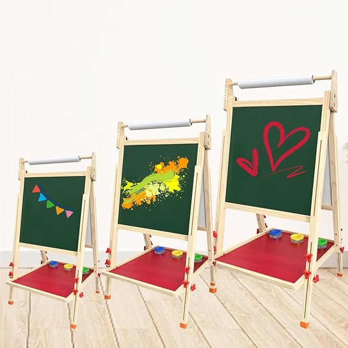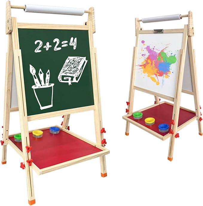 - Abundant and multi-functional accessories:Accessories include 3 whiteboard pens, 1 roll of paper, 1 animal stickers, 1 number and letter stickers, 6 dust-free chalks, 1 removable eraser, 1 magnetic ruler, 1 chalk holder , 3 water cups, and abundant accessories allow painters to unleash his or her imagination.This double sided wooden art easel can not only be used as a unique gift on birthdays, Christmas, and festival, but also can be used as a unique item for other activities.