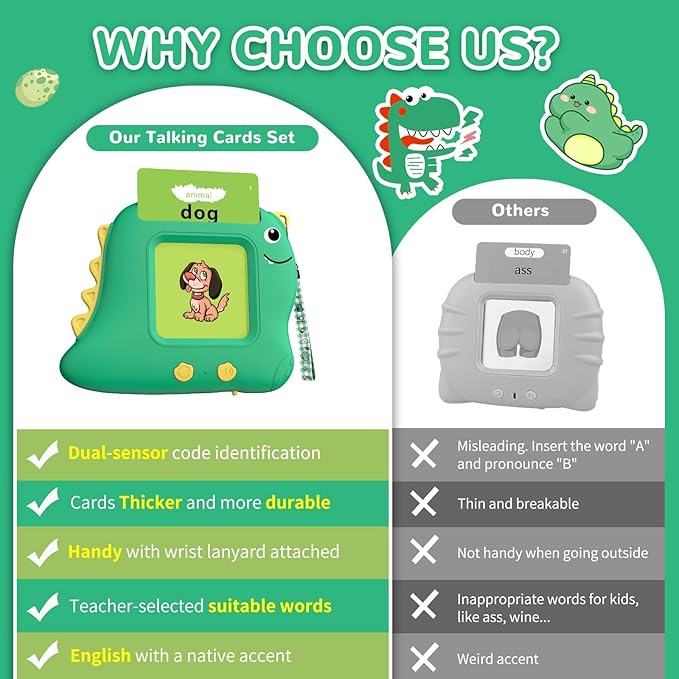 - Upgraded Tech & Content: our words and images were teacher-approved. Not like other brands including inappropriate words. And our cards are thicker and more durable for little kids to use. Not easy to damage and bend. Equipped with dual sensor barcode recognition, no worry sounds and cards do not match. Offer a wrist strap lanyard to attach, convenient for children to use outdoors, in the car, road trips and airplane. Great travel essentials busy toys for little ones.
