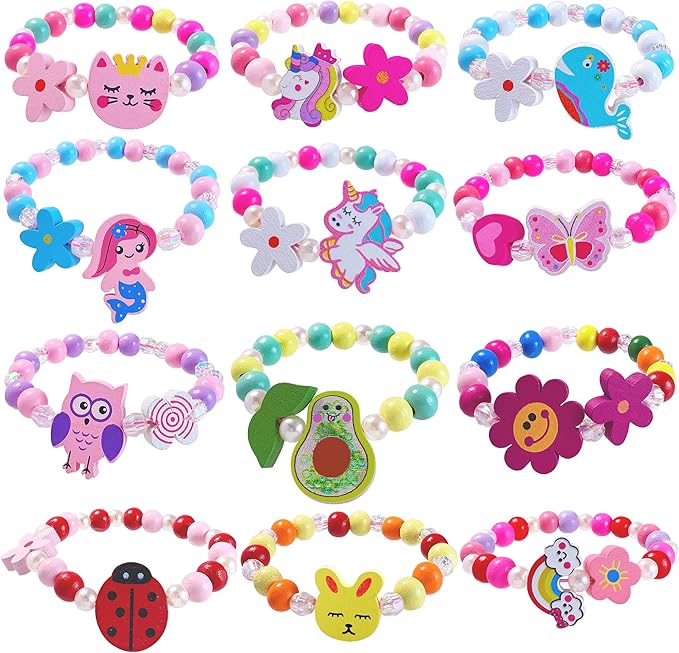 12 PCS Girls Bracelet for Kids Unicorn Mermaid Wooden Beaded Bracelets Birthday Party Favors Goodies Bag Stuffers Fillers Cute Pinata Stuffers Rainbow Butterfly Heart Jewelry Gifts