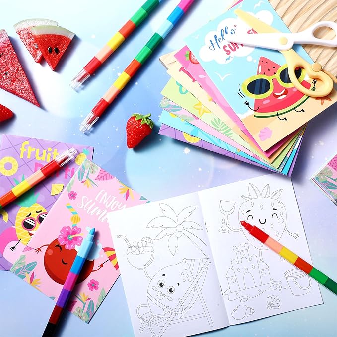 - Summer Fruit Party Favors: you will receive 24 pieces of summer coloring books in 8 styles, 3 books for each style, each coloring book has 6 sheets of double-sided printing paper, a total of 12 pages different cute pattern, package come with come with 24 pieces of stacking crayons, each crayon has 12 sections of different colors; Keep children entertained for hours with this set that includes everything they need to create colorful works of art