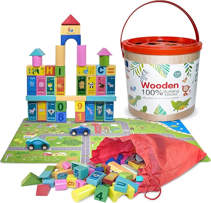 Wooden Blocks Set for Toddlers, Preschoolers, Educational Building Toys, Multicolor, with Storage Bucket and Bag., Medium, WB002