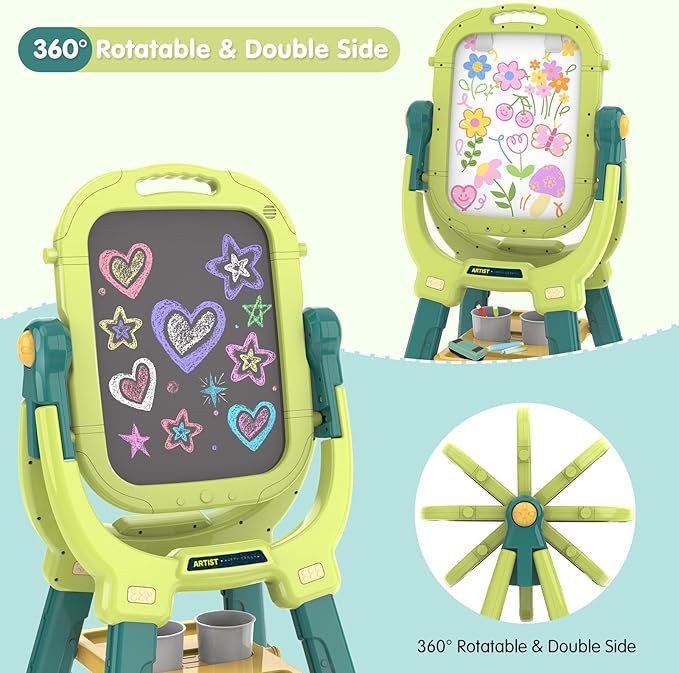 - 360°Reversible Rotatable - Victostar Art Easel with magnetic chalkboard and whiteboard. Two children can play at the same time, the whiteboard supports watercolor painting, while the blackboard can be used to practice calligraphy and study. It is equipped with complete painting tools, which can be rotated 360 degrees to meet the various painting needs of children.