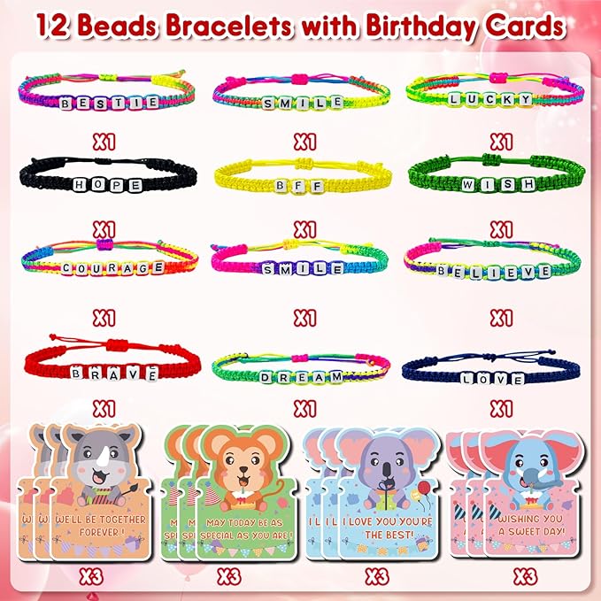 - [Beaded Bracelets Bulk with Birthday Cards]: You will get 12 Birthday cards in 4 cute card pattern designs and 12 friendship bead bracelets with sweet messages. There are creative birthday gifts for their friends by using these cute bead bracelets gift sets, this will not only keep friendships alive but also make more new friends in this way.