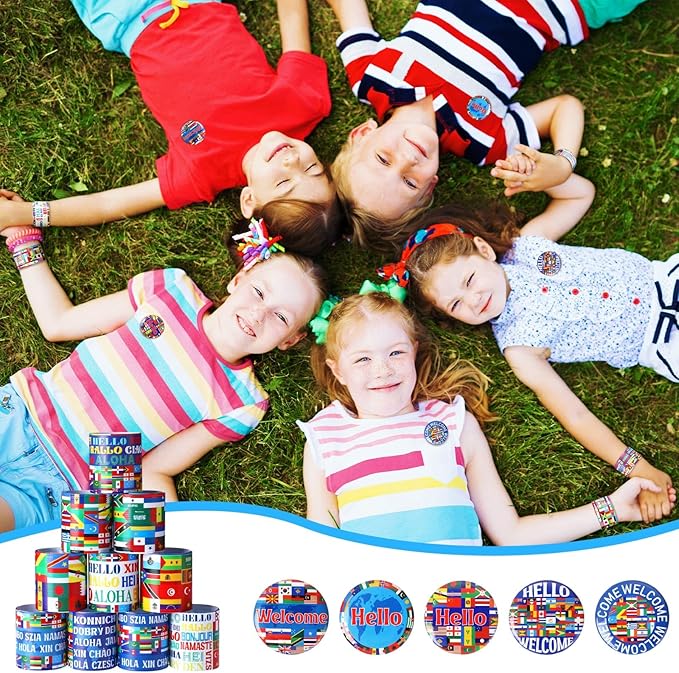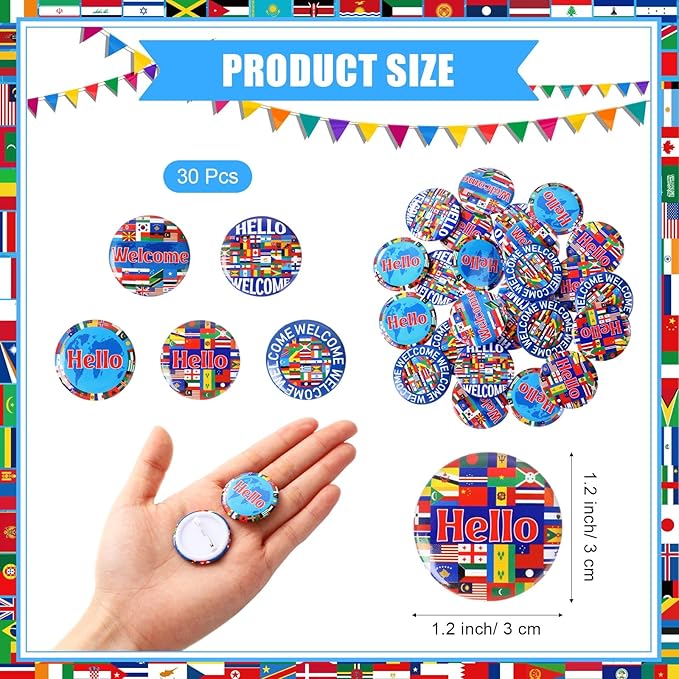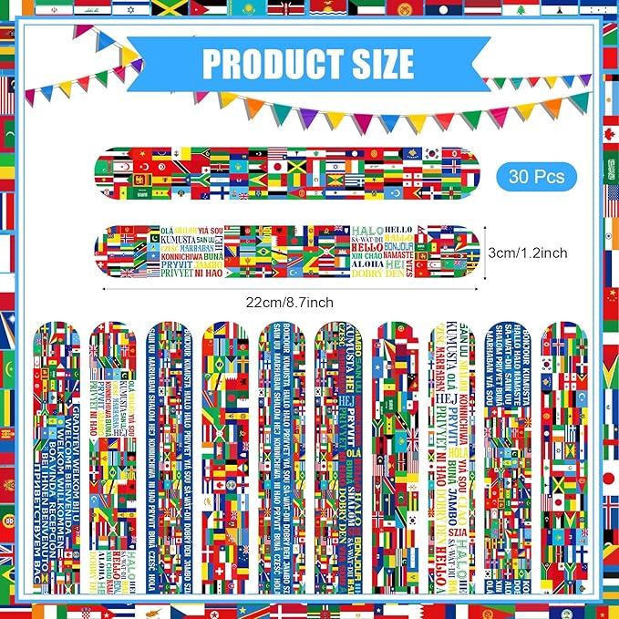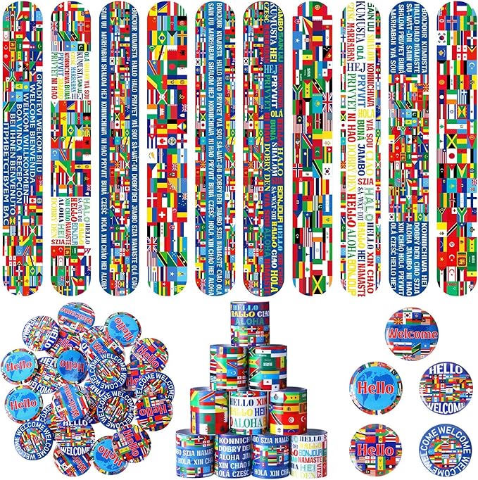 - International Party Decoration: our around the world party favors like flags slap bracelets and buttons pins feature different international country flags, the badge pins read some positive words like [ HELLO] , [ WELCOME] , which represent countries around the world and bring you a travel trip around the globe theme party experience