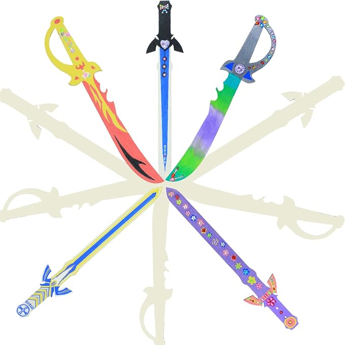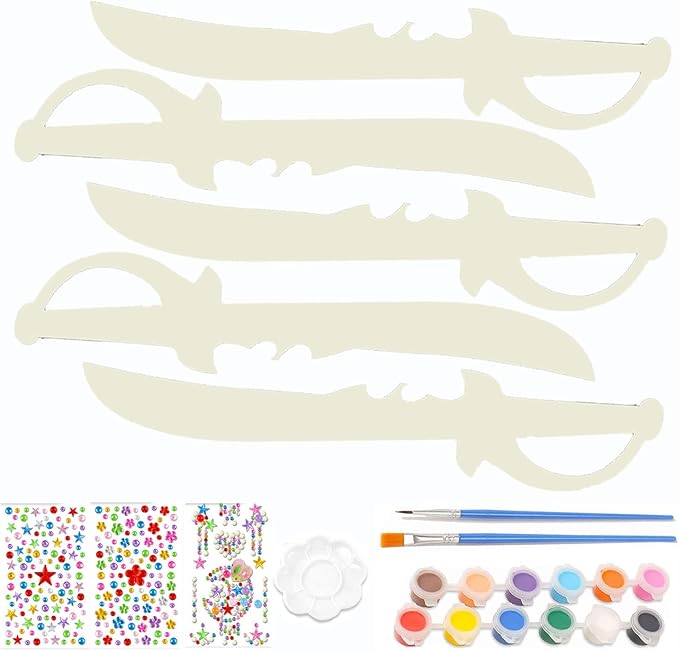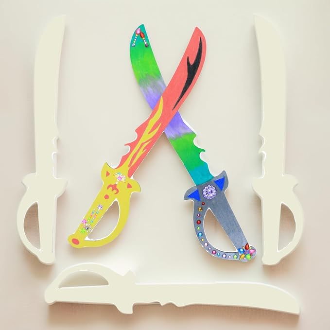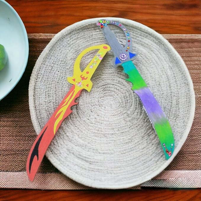 - The words forkids includes 10 blank wooden chip swords, 12 different colored pigments for painting, 2 color palette, 5 different colored diamond stickers, and a part of the hemp rope that can be tied to the handle of the wooden chip sword. The diverse materials provide greater imagination space for creating creative and unique designs
