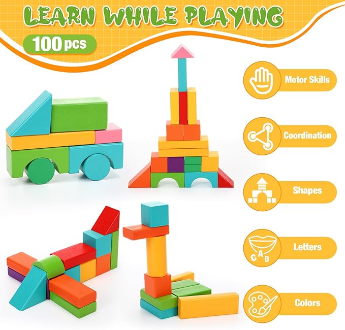 - Excellent Handmade Wooden Building Blocks: step into a world of vibrant colors and experimental designs with our 100 piece traditional style, handmade wooden block set; A Montessori toy, these blocks will excite your little ones to play, learn and discern between different colors and shapes