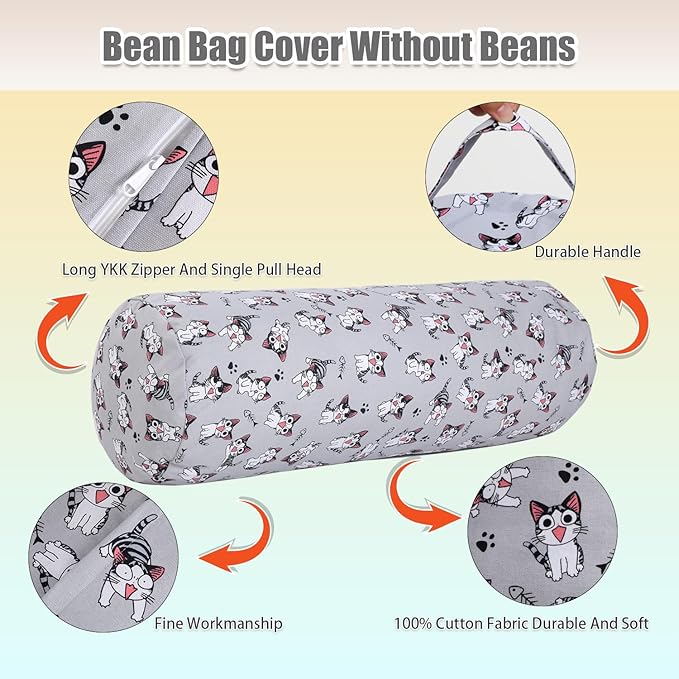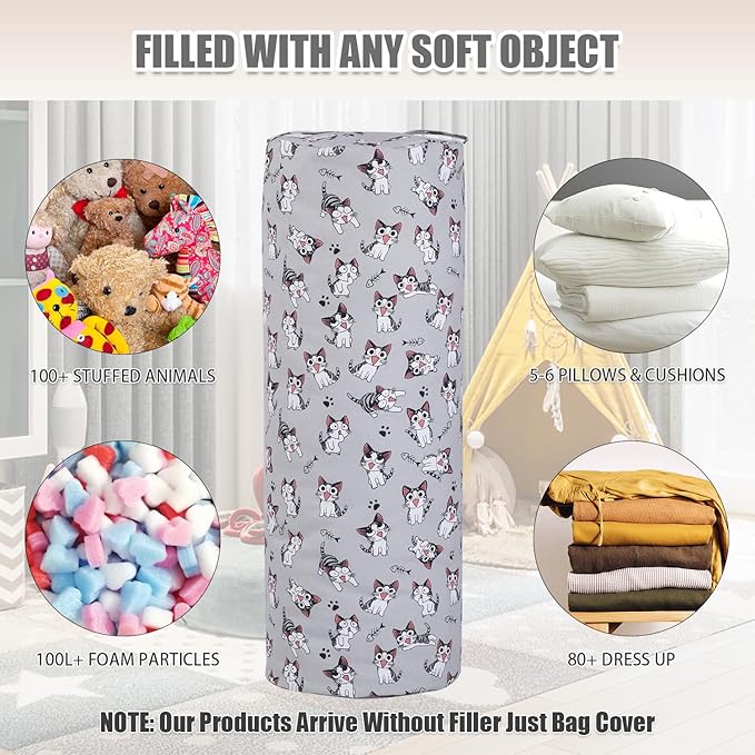 - MULTIFUNCTION CYLINDRICAL STUFFED ANIMAL STORAGE BAG: The bean bag cover is cylindrical and can be stored upright in corners without taking up too much space. When the bean bag is filled with plush toys or other soft items, it can be used as a chair or sofa for kids and teens to read, relax, sleep, watch TV, or play games, increasing interaction between children. It's also a piece of decorative furniture for your home.