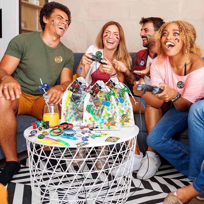 - Video Game Party Favors: with 194 pieces of video game party supplies, It includes 16 each of straws, video game stamps, bubble wands, keychains, silicone bracelets, tattoos, badges, cards and organza bags, 50 stickers