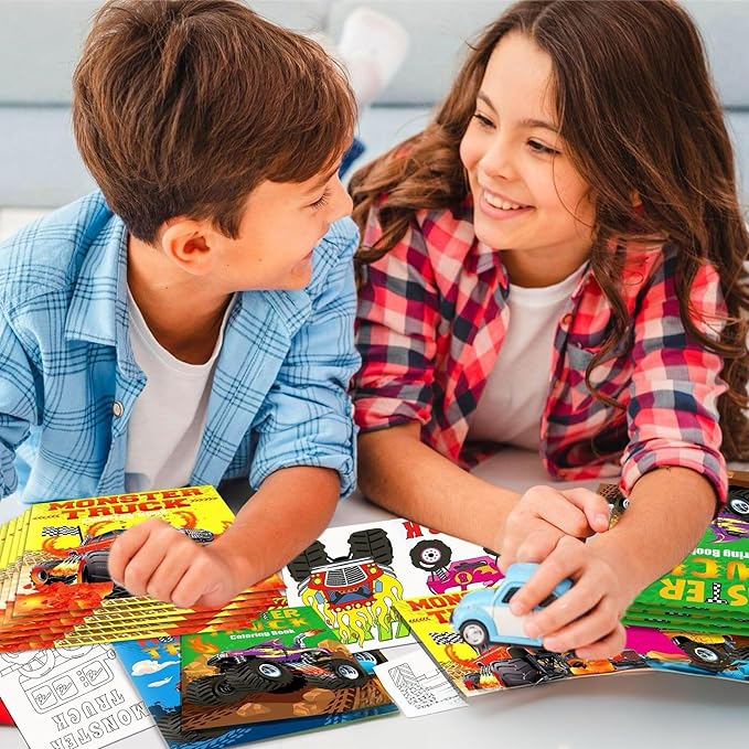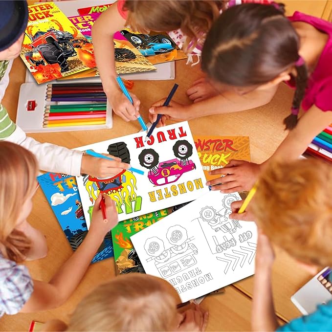 - Package Include: you will get 12 monster car coloring books,12 crayons in 8 different,50 PVC stickers ,12 monster car slap bracelets ,12 keychain,12 truck car toys,8 DIY stickers,12 tattoo stickers, 12 plastic gift bags.A complete monster car school party favor set for your use.