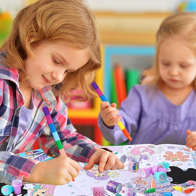 - Suitable Size: mermaid coloring book for kids about 6.7 x 4.7 inch, crayons about 7 inch, slap bracelets about 8.7 x 1.2 inch, stampers about 1.38 inch, make-a-face stickers about 6.7 x 4.3 inch, color scratch about 5.1 inch, stickers about 4.7 x 2.7 inch, little mermaid party favor set fit in most birthday baby shower party goodie bags.