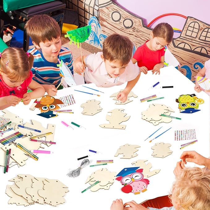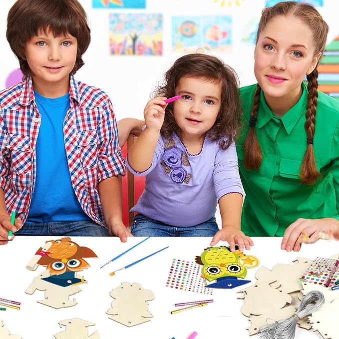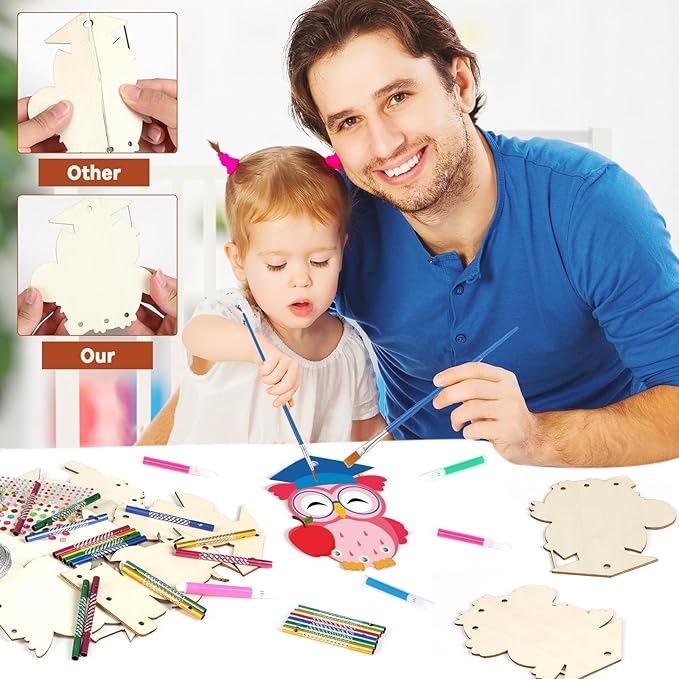 - 【Premium Materials】Our owl Crafts for Kids are made of high-quality natural wood,which is thicker than other wooden slices. Each piece is polished, with a smooth surface and neat cuts. The edges are not sharp, ensuring safety and environmental friendliness. It is easy to write on or paint.In addition to the painting brushes, we also have a box of watercolor pens,allowing children to change their designs according to their own ideas and unleash their creativity!