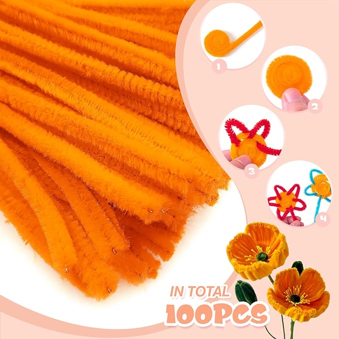 TOAOB 100pcs Pipe Cleaners Orange Pipe Cleaners Chenille Stems 6mm x 12 Inch Fuzzy Sticks Crafts Supplies for DIY Art Crafts Decorations