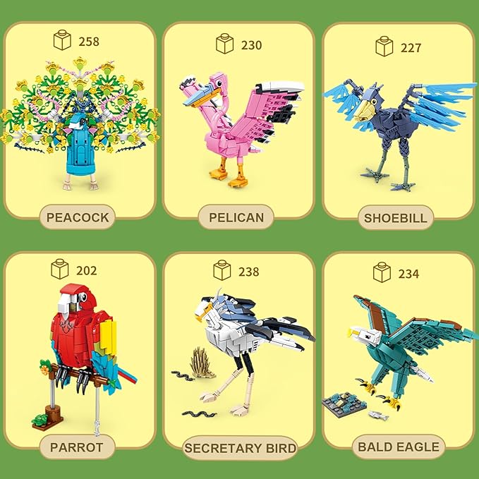 - Posable Bird Models:This KAZI bird toys building block set features 6 birds model for kids 8 years old and up:macaw parrot,peacock,secretary bird,bald eagle,pelicans and shoebill.The toy birds are richly colored and comes with jointed parts.