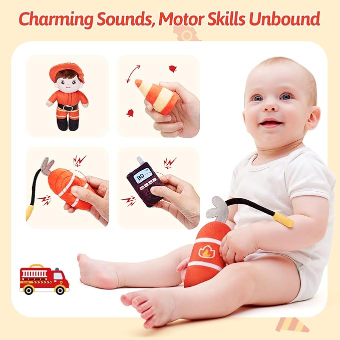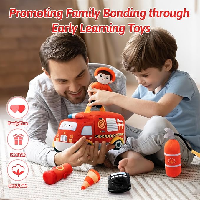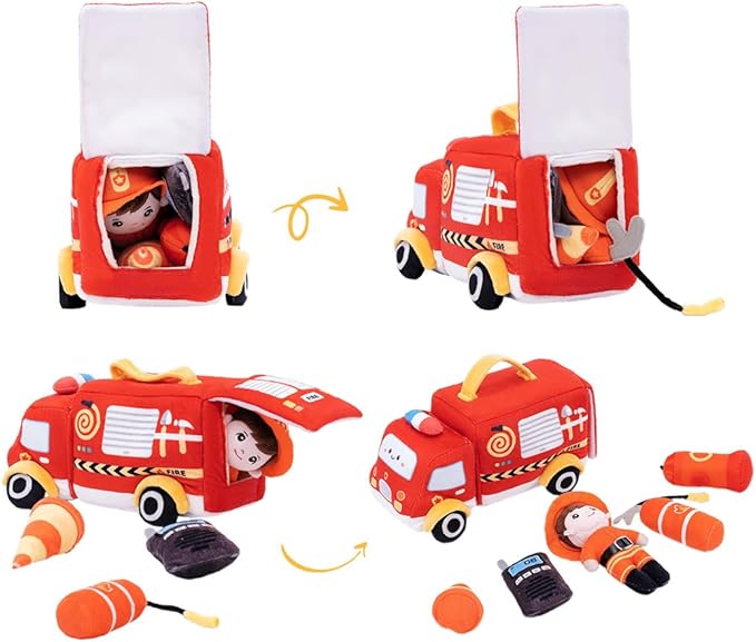 - 🔥CONVENIENT STORAGE: The large fire truck doubles as a storage unit. Its interior can accommodate all the fire plush toys, keeping the room tidy and clutter-free. This baby car toys also comes with a handy carrying handle, perfect for kids to take on-the-go.
