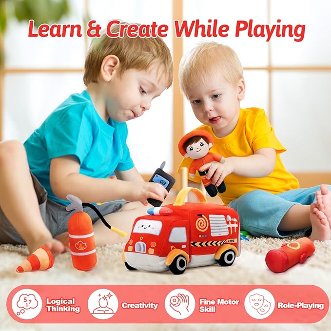 - 🧯LOGICAL THINKING: This plush fire truck playset can be enjoyed both indoors and outdoors. Kids can use their imagination to perform rescues in different fire scenarios, creating endless possibilities for play. Let your kids develop their logical thinking and creativity as they figure out the best ways to put out fires during these exciting rescue activities.