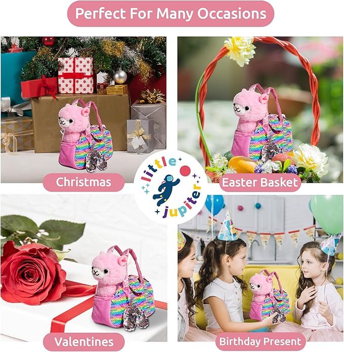 Little Jupiter Pet Plush Set with Purse w/Reversible Sequins & Charm - Stuffed Animal Toy for Kids Ages 4-7 - Stuffed Animal Purse - Stuffed Animals for Girls - (Pink Llama)