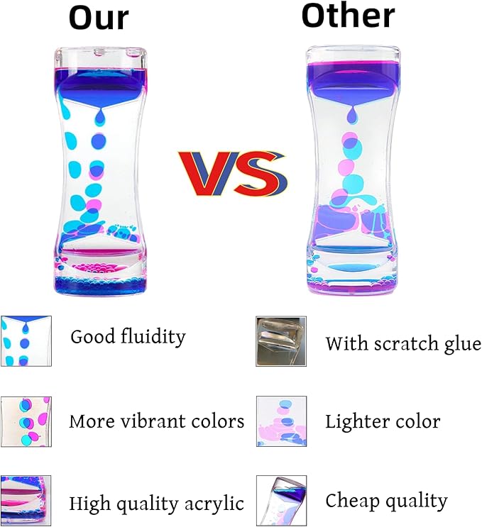 - Relaxation Stress Relief Toy : The oil and water sensory toy helps children and adults to focus, relieve anxiety and fight boredom. The oil drops create great visual effects as they fall, not only helping us to relax, but also providing visual fun. The liquid timer is especially great for people with autism, ADHD and those who work long hours in front of a computer, helping you relax while providing hours of entertainment