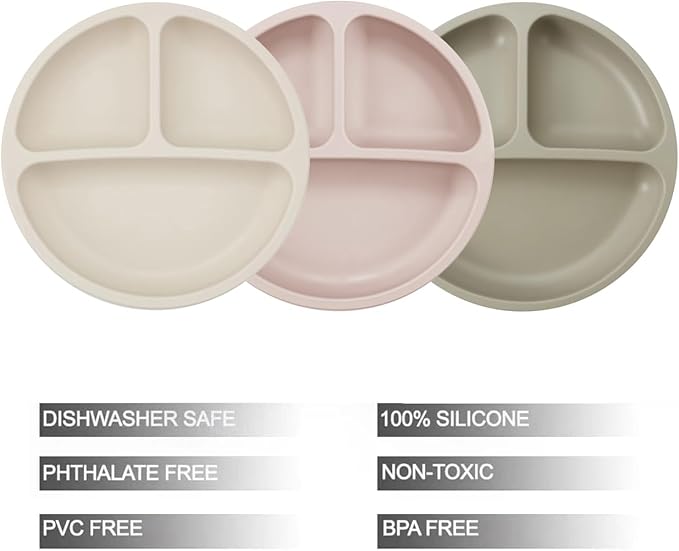- BABY SUCTION PLATES: Give your little one more independence at mealtimes with their very own silicone plate featuring 3 divided sections. The non-slippery with sunction design will prevent plates from skidding. Use a bit of water under suction before using for best results.
