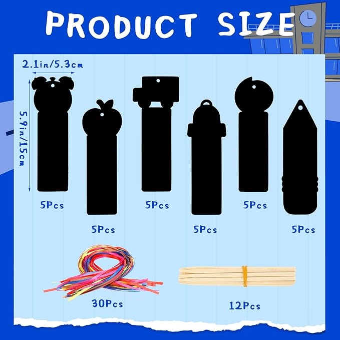 - Package Content: We provide 30 pieces back to school scratch bookmarks kit, including 30 beautiful scratch bookmarks (has a size of 15x5cm/6x2inch), 30 colorful ribbons and 12 bamboo sticks, which are sufficient to enjoy a happy DIY time on the first day of school
