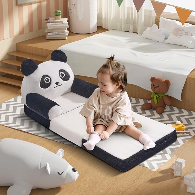 Kids Sofa Chair for Toddler, 2-in-1 Folding Soft Baby Couch with Removable Cover, Comfy Plush Children's Recliner, Convertible Floor Sofa Bed to Lounger for Girls Boys Age 1-3,Panda