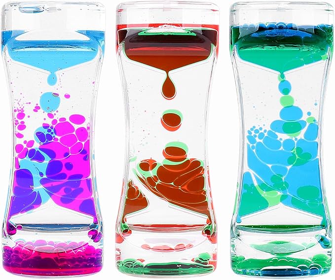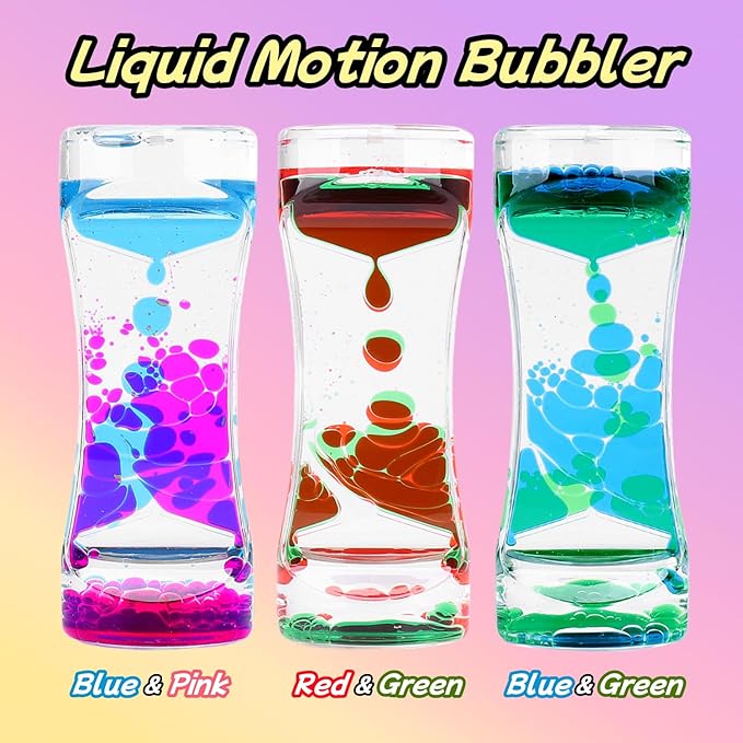 - Liquid Motion Bubbler Sensory Toys: This fascinating liquid motion can be used as a therapeutic toy and stress reliever, it is both fun and stress relieving, loved by children and adults. It requires no batteries or power, just turn it over and it restarts and the energy never runs out