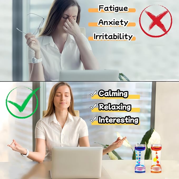 - Fun and Relaxing: The hourglass timer helps children and adults focus, relieve anxiety and fight boredom by allowing gravity to guide the colored oil drops from top to bottom at a slow, steady pace. The liquid timer is especially great for people with special needs or those who work long hours in front of a computer, helping you relax while providing hours of entertainment