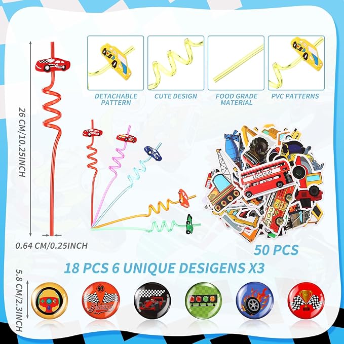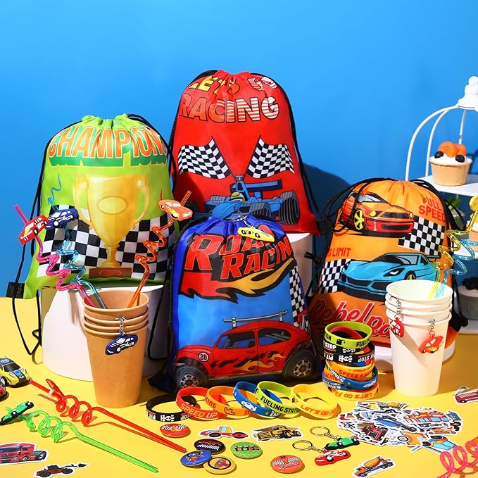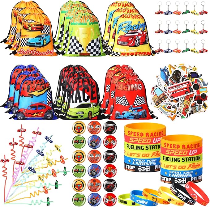 - Sufficient for Your Party: our racing car party favors include 18 drawstring bags, 18 silicone bracelets, 18 drinking straws, 18 keychains, 18 button pins, and 50 race car stickers with various patterns; Ideal for a car birthday theme party, these set will heat your celebration and make it unforgettable