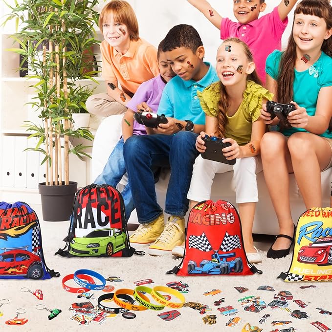 Sadnyy 140 Pcs Race Car Party Favors Birthday Party Decorations Supplies Drawstring Bags with Silicone Bracelets Keychains Straws Button Pins Stickers for Classroom Rewards Goodie Bags Stuffers