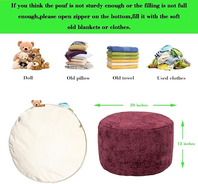 - 【Pouf cover with PP Cotton Pouf filler and the extra supplementary filler】Too many complaints on the filler,as it is too soft,we ship one pouf filler and the extra supplementary filler,you can add or not as your decision.If you still think it is not sturdy enough,you can add extra soft old blankets and clothes.