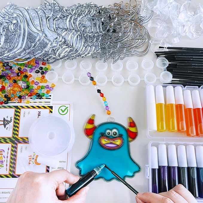 • Quantity: DIY Halloween Suncatcher Paint Kits include 30 Halloween suncatchers in 10 designs, each design has 3 pcs. 20 bottles of 11 Halloween colors suncatcher paints (6ml per bottle), 1 strip of 8 empty paint pots, 30 paintbrushes, 360 Halloween acrylic beads, 1 roll of fishing thread, 30 suction hooks, and 30 Halloween gift stickers. Each Halloween window suncatcher has a hole at the top for hanging. Perfect for Halloween parties, family fun, classroom activities.
