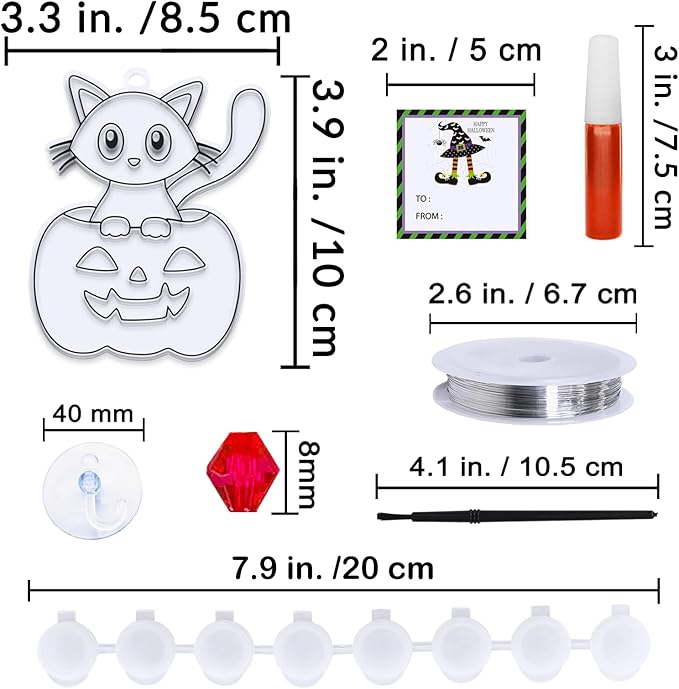 - Size: These transparent Halloween window art suncatchers are about 4" in diameter. Each bottle of suncatcher paint holds 0.2 fl oz (6ml), and each mini empty paint pot holds 0.06 fl oz (2ml). The acrylic beads measure about 0.3" in diameter, and the fishing thread is 16 yards. Each suction hook is about 2.4" in diameter. Once completed, the Halloween window hanging suncatcher ornaments are perfect for glass windows, doors, porches, or gardens, casting a warm and festive glow as they capture the sun's rays.