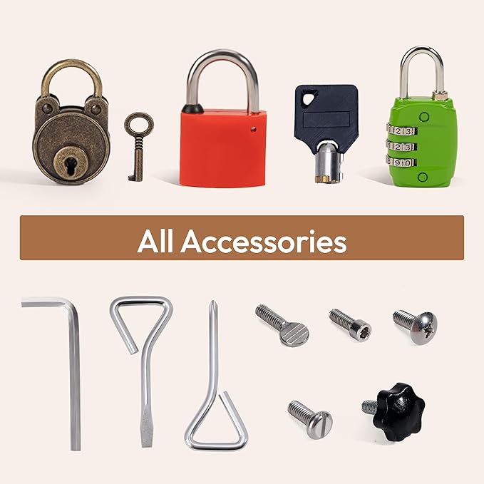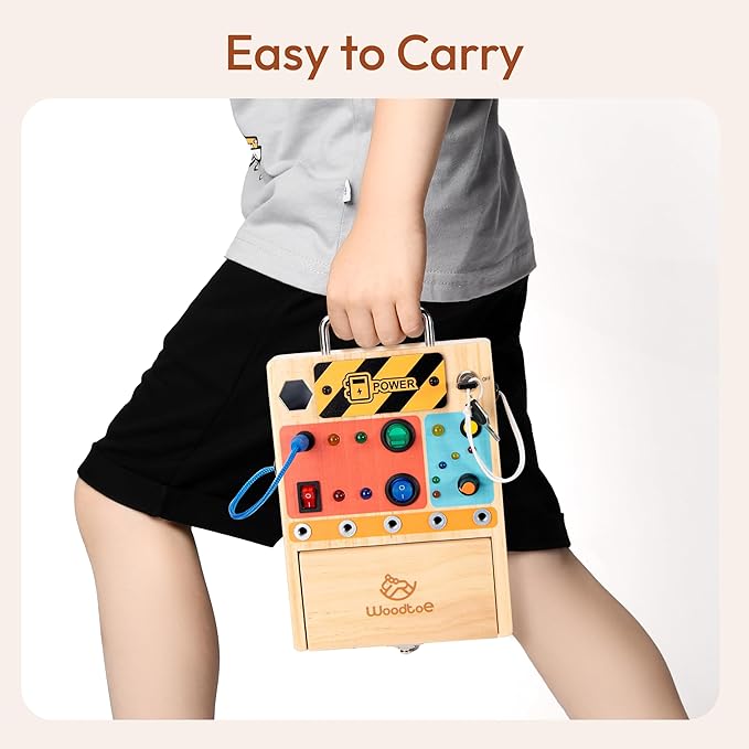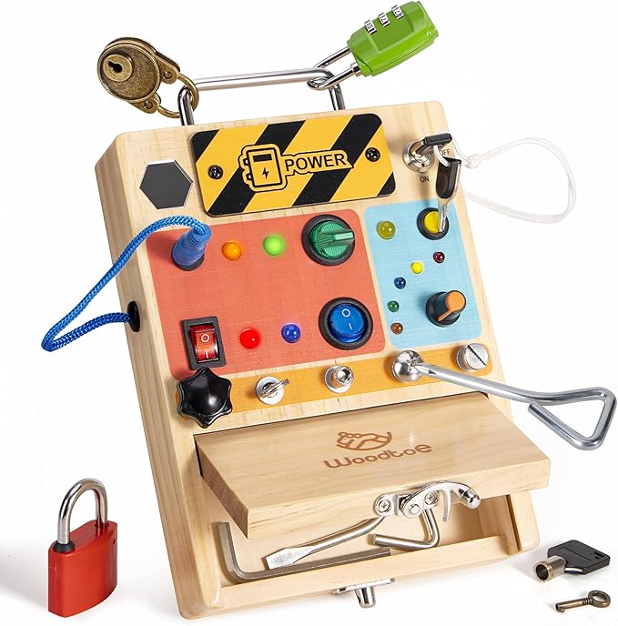 - Rich Accessories: The sensory board includes 1 wooden box, 6 different switches, 10 LED lights, 5 screws of different shapes, 2 screwdriver tools, 3 unique locks and keys, and a product guide. The wooden busy board helps develop children's hands-on abilities, hand-eye coordination, and fine motor skills. Not include AAA batteries! (Green lock code: 000)