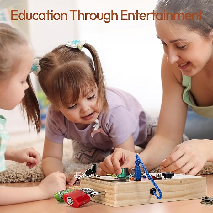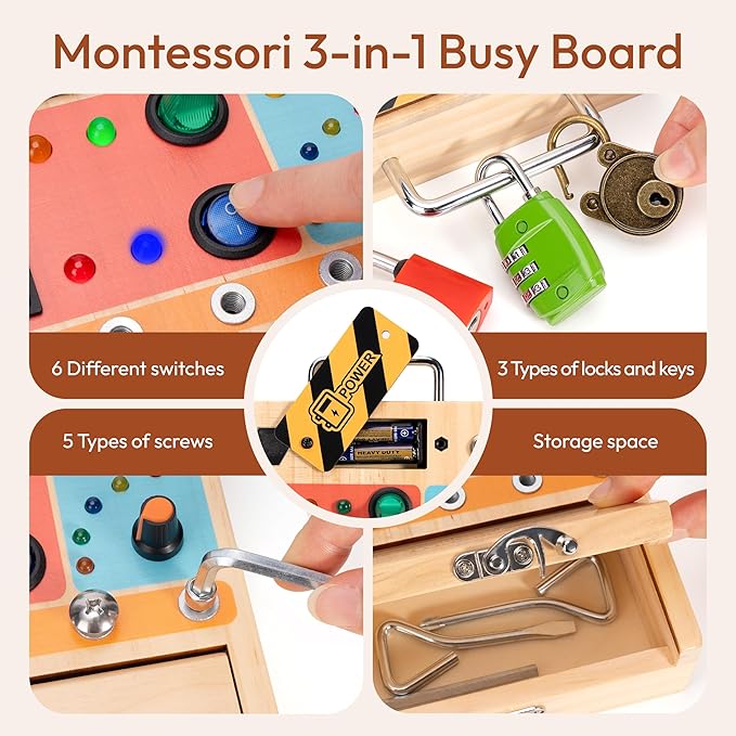 - 3-in-1 Busy Board: Compared to other products on the market, this Montessori busy board offers a multi-faceted game experience of switching light, screwing and unlocking. The wooden Montessori toy is designed with light switches of varying complexity, and each LED's brightness is adjusted to be child-friendly, protecting their eyes during play. The screwdriver toy, along with the lock and key set, helps children develop life skills. These interactive features engage children more deeply, capturing their attention and keeping them away from electronic screens