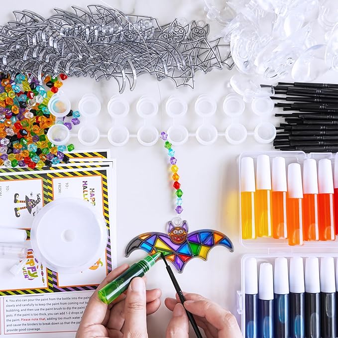 • Enhance kids' Halloween decorations with our 27 Halloween Bat Suncatchers Craft Kit: This Halloween craft kit includes 27 Halloween bat suncatchers in 9 designs (3 pieces per design), 20 bottles of 7 Halloween paint (6ml each), 1 strip of 8 empty paint pots, 27 paintbrushes, 324 Halloween beads, 1 roll of fishing thread, 27 hooks, 27 gift stickers. This Halloween bat suncatchers paint kit is perfect for kids' Halloween crafts, fall activities, and holiday decorations.
