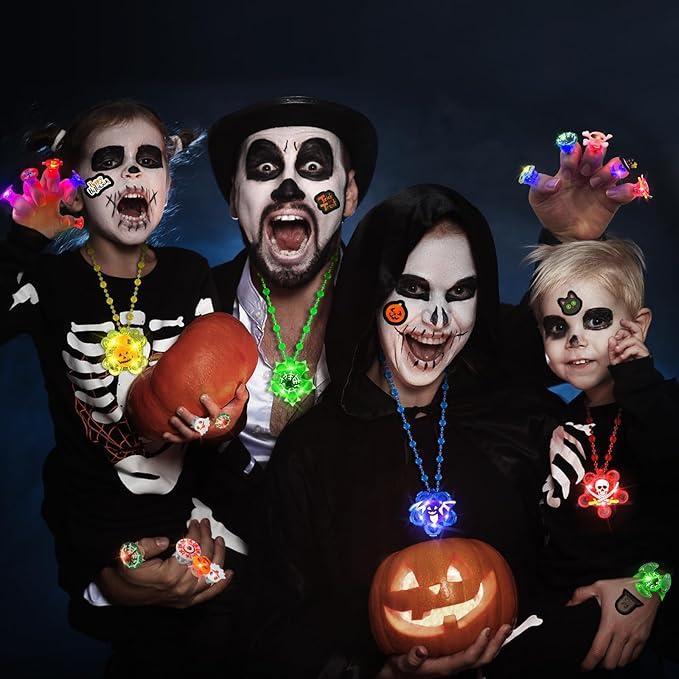 - [ Halloween elements ] Like Pumpkin, Spider, Bat, Ghost, Skull with the bright vibrant colors. The Necklaces Bracelets can be rotating, and led ring can flash for blue or red light, and temporary tattoos will glow in the dark. These light up flash Halloween toys will very popular party favors or kids hot bulk toys or so attractive to kids for Halloween treat bags or Halloween party supplies